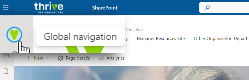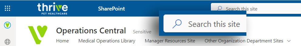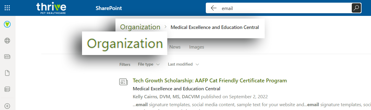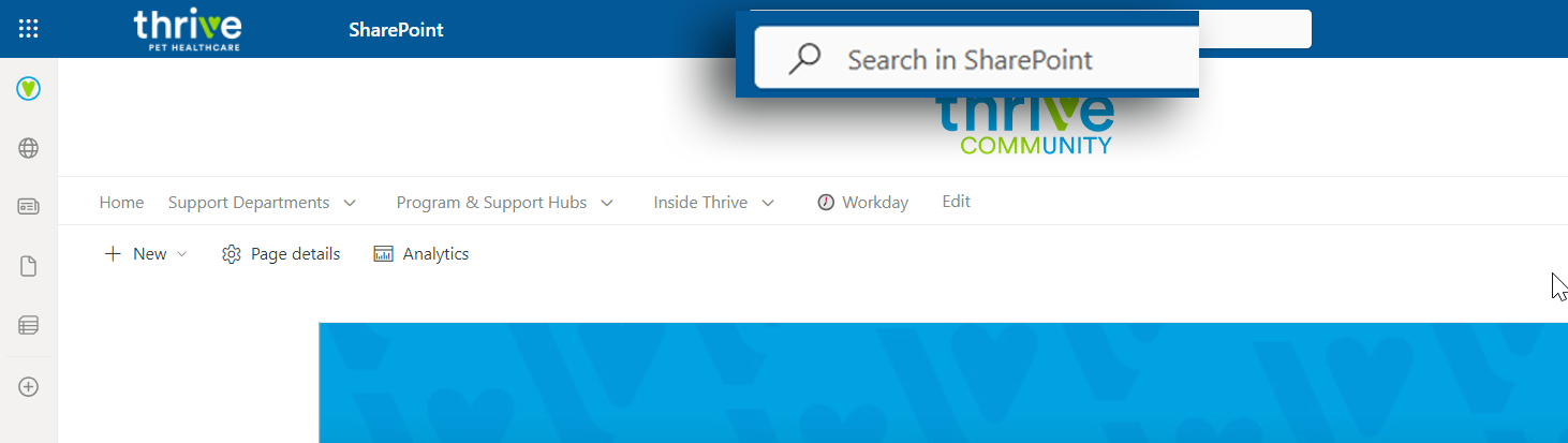 Click the heart in the upper left corner of any Community page to utilize global navigation → Home and gather search results across all of SharePoint (Community) irrespective of the department.