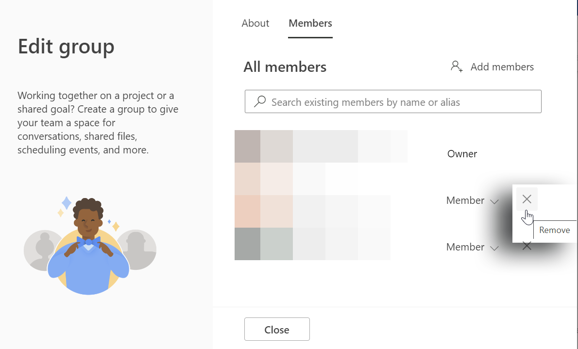 Under the Members tab, find the member to remove and select the ✖️ .