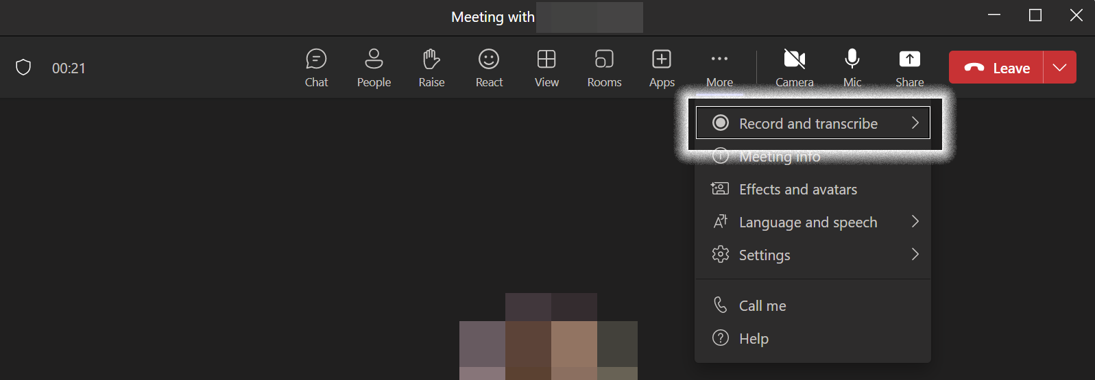 Once in the meeting, click the three dots (ellipsis) at the top of the meeting window, select Record and transcribe, then select Start recording.