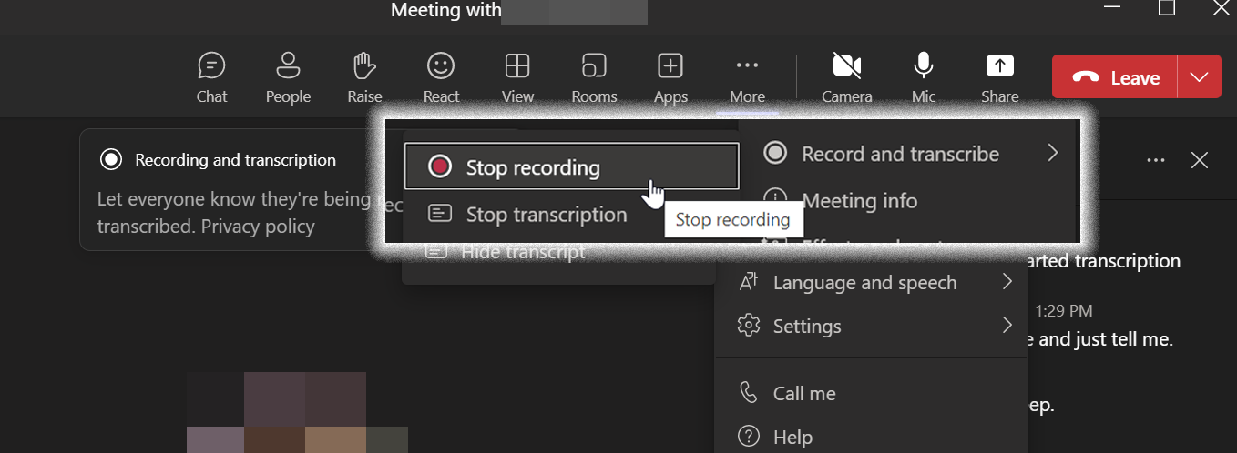 Once the recording is finished, select Stop recording, leave the meeting and the recording will auto-generate within the meeting chat window.