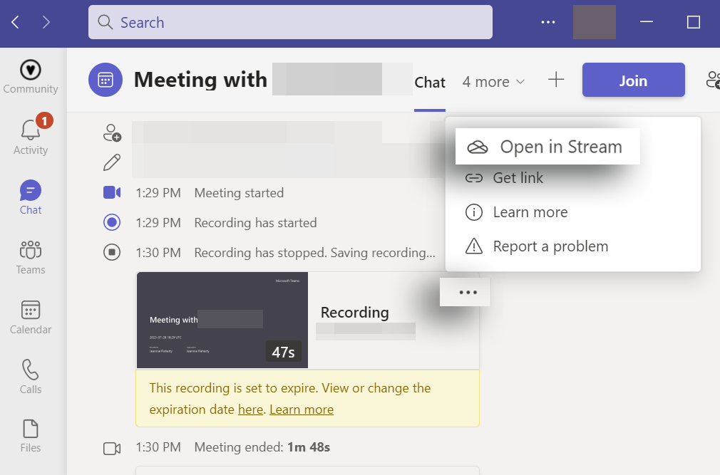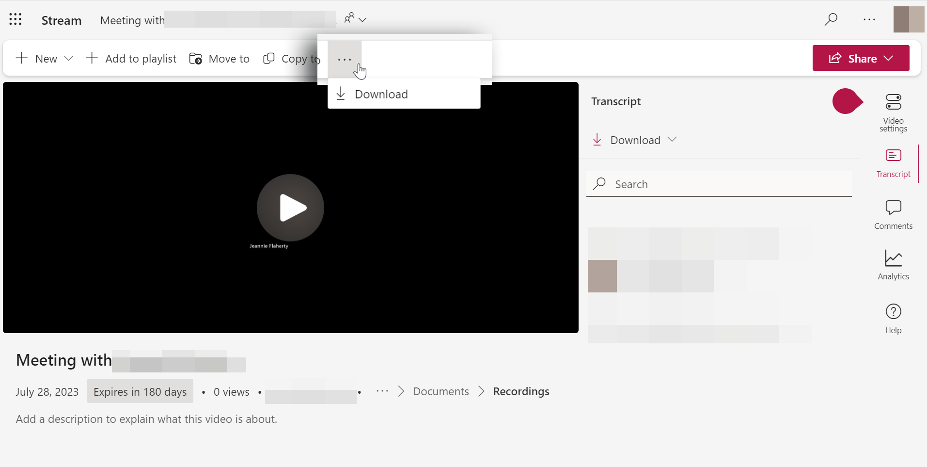 To download the meeting recording, find and click the three dots (…) in the upper right-hand corner of the recording in your meeting chat. Click Open. This will open the video in Stream for SharePoint.