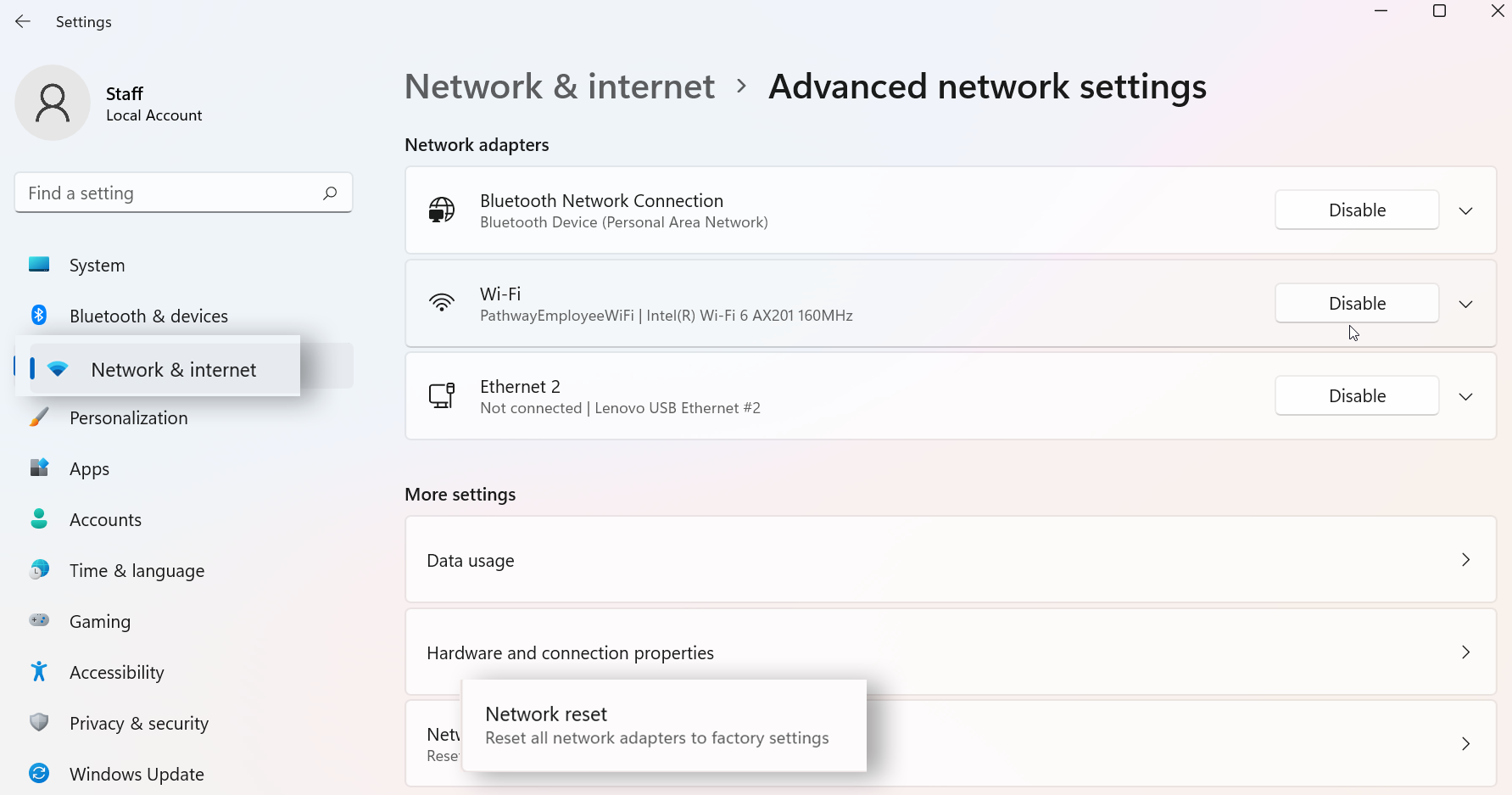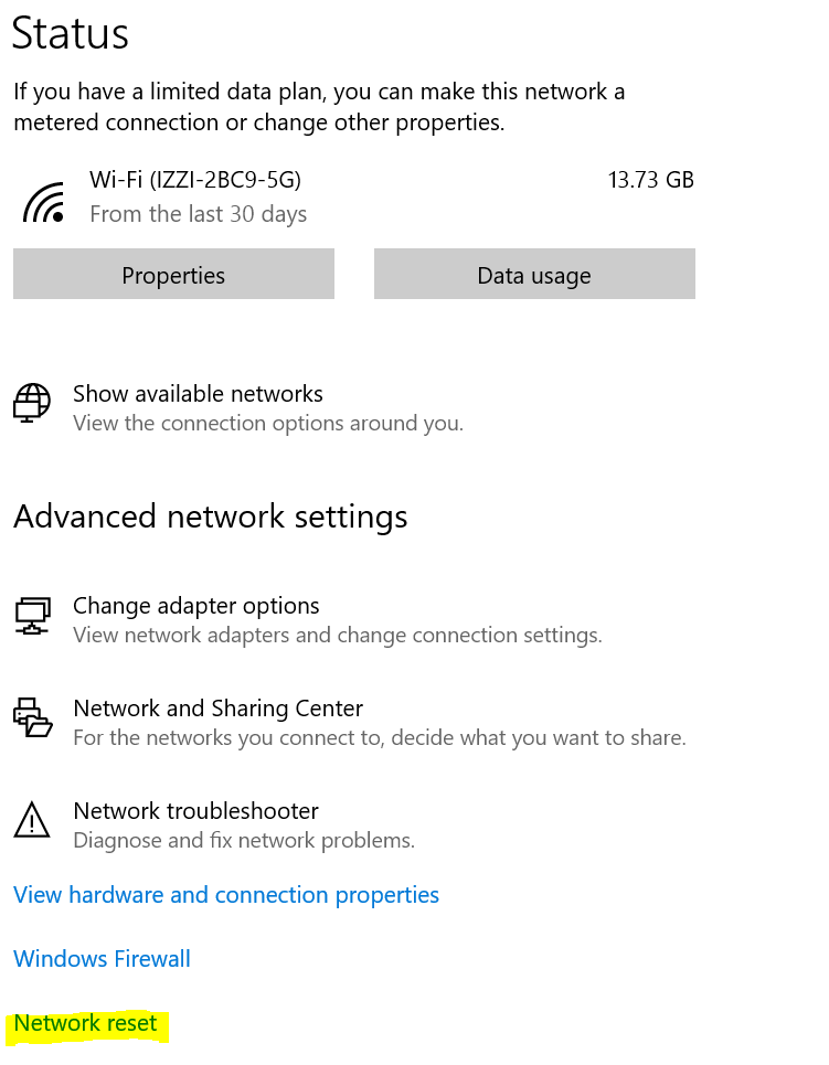 Navigate to Start Menu > Settings > Network & internet > Advanced network settings > Network reset
