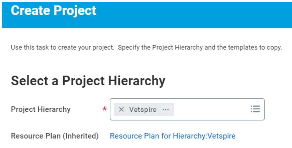 2. Select the appropriate Project Hierarchy for this project from Create Project Task. Select OK at the bottom of the page to continue. To create a new Project Hierarchy, contact workday@pathwayvets.com.