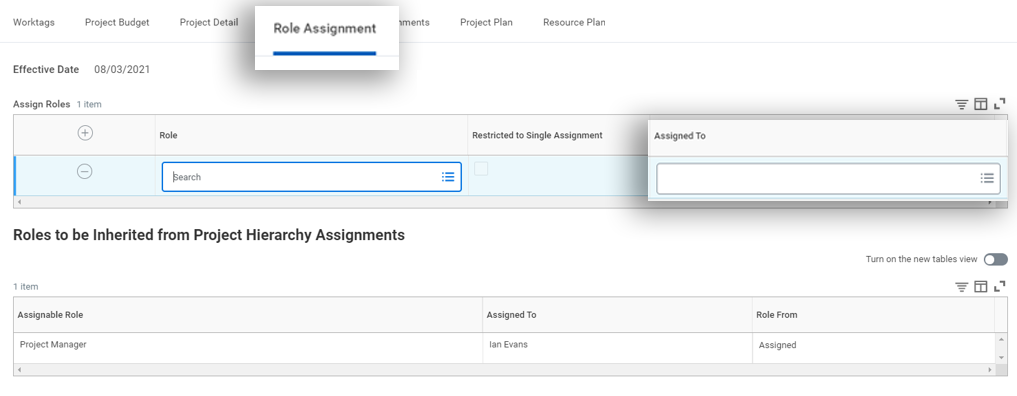 4. Role Assignment tab: Do not confuse Project Roles with Project Resources; we will look at those on another tab. The Project Manager role is inherited from the Project Hierarchy. To change this for a specific Project, select the drop-down under Roles, enter Project Manager, and enter the project manager's name under Assign To.