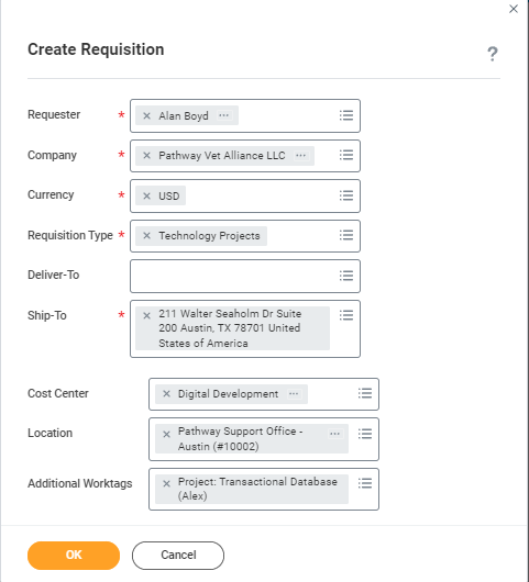 Project: (Name of Technology Project creating requisition for.. Note- if you do not see your project, please contact @a user to have the new project created in WD)