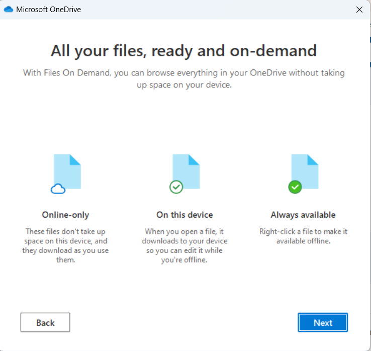When Files On-Demand is on, all files are seen as online-only files in File Explorer, but they won't take up space. When you’re connected to the Internet, you may use the files like every other file on your device. When items are synced, a cloud or sync icon may be seen by the folder. Local files are marked accordingly.