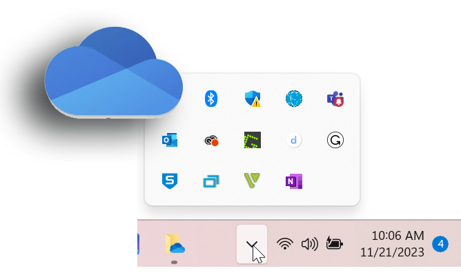 In the Windows notification area, select the blue OneDrive cloud icon in the lower right-hand corner of your notification area.