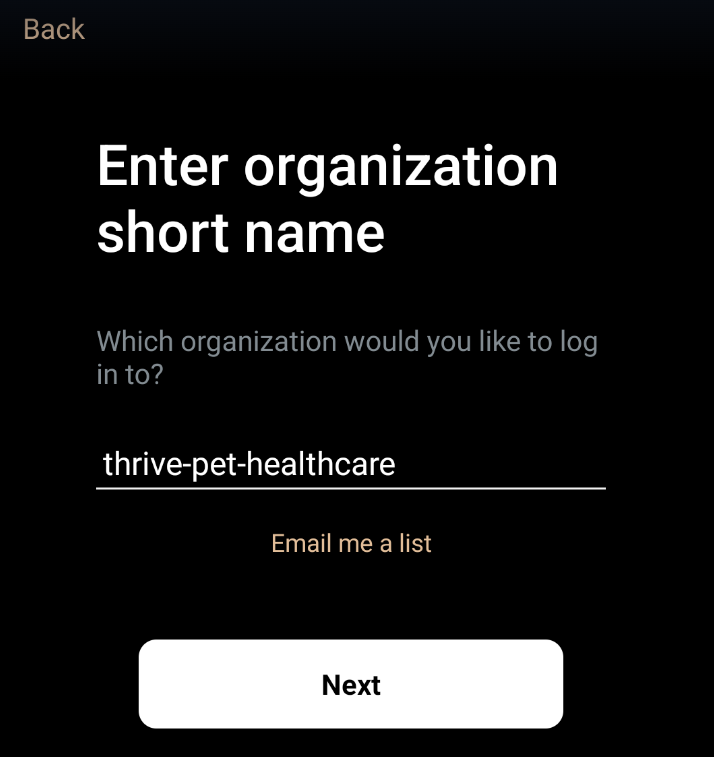 If asked for an organization’s short name, enter thrive-pet-healthcare.