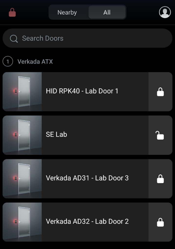 Once logged in, see a list of nearby doors available doors for Bluetooth unlock.