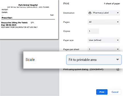 Confirm the printing Scale is set as Fit to Printable Area. You can see in the Print Preview below that everything fits on the label.