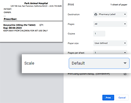 BEST PRACTICE: Check the print preview before printing. When the scale is set to default, the information is pushed off the label.